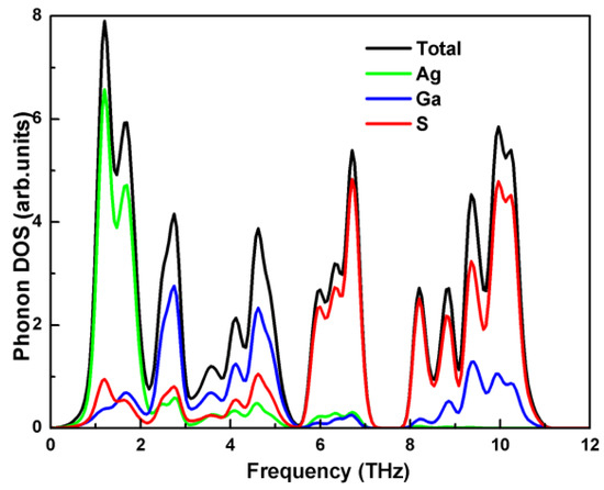 Because there are 8 atoms in the unit cell of chalcopyrite type compound AgGaS2, the phonon spectrum includes 24 branches (3 acoustic and 21 optical branches). The phonon spectrum is divided into 3 energy intervals; the 3 acoustic branches are linear in wave vector q for a small q. The contribution of optical branches to thermal conductivity is not considered with their small group velocities, seeing from the flat distribution in Figure 2. The optical branches overlap with the acoustic branches in low frequency, which benefits to the low conductivity of AgGaS2 as confirmed in other chalcopyrite type compound CuInTe2 [40]. The flat phonon branches along the X–P direction indicate the intracellular interactions are stronger than those between the cells in this direction. We note that all modes along the X–P direction are double-degenerated. As shown in Figure 2, the frequency of the phonon increases with the increase of pressure. The fundamental cause of this phenomenon is that the bond lengths of Ag-S and Ga-S become shorter with the increase of pressure. The shortening bond lengths lead to larger force constants, which benefits higher vibration frequencies. We investigated the vibrational property further to explore the contribution of the atoms to the phonon spectrum; the total and partial phonon densities of chalcopyrite type compound AgGaS2 at 0 GPa are plotted in Figure 3.