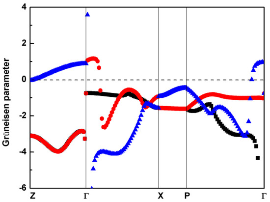 where is the frequency of the jth phonon mode at wave vector q, and V is the volume. To obtain the shift of the phonon frequency caused by the volume change, it is necessary to consider 3 phonon calculations under 3 different volumes. The 3 volumes are the equilibrium volume, a volume slightly smaller than the equilibrium volume, and a volume slightly larger than the equilibrium volume. In our work, we compressed and expanded the equilibrium volume of AgGaS2 by 0.3%. The calculated mode Grüneisen parameters of the 3 acoustic branches under 0 pressure along the high symmetry points are shown in Figure 4, in which the black and red symbols denote the transverse acoustic (TA) mode, and the longitudinal acoustic (LA) mode is represented with the blue symbol.