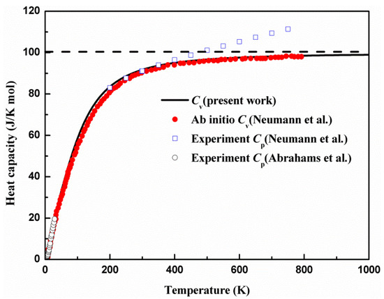 The calculational results are in line with previous first-principles theoretical report [50]. The calculated Cv agrees well with the measured Cp in the temperature range below 40 K [51]. As the data of the measured Cp are scarce in the temperature range from 40 to 200 K, it is difficult to compare the calculated data with measured data. We found that the discrepancy between the calculated Cv and measured Cp continuously increased with the increase of the temperature for the temperature range above 400 K [16], and this indicates the essential difference between Cv and Cp. The consistency of the calculated Cv and measured Cp at a low temperature implies the contribution from the phonon anharmonicity to the heat capacity is insignificant and can be neglected. The Cv strongly depends on temperature when temperature is below 200 K. We found that the heat capacity Cv dramatically increased cubically as a function of temperature at a low temperature (below 200 K). When the temperature is higher than 200 K, the heat capacity rapidly slows with the temperature. The heat capacity almost reaches a constant and follows the Dulong–Petit law at a high temperature (above 700 K), when the anharmonic effect is significant.