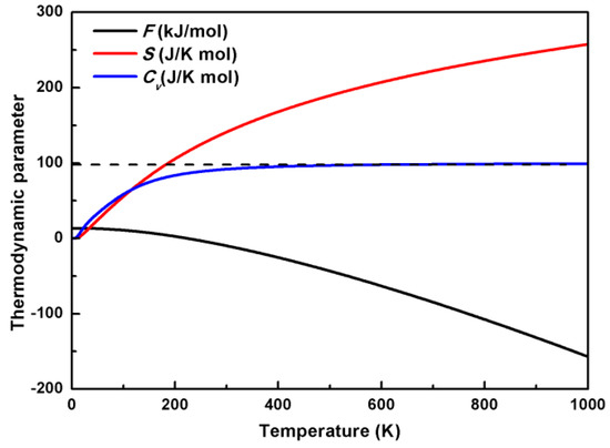 Table 3 shows that the entropy and heat capacity linearly decrease approximately with the increase of the pressure at a constant temperature. The Helmholtz free energy has an opposite trend with the pressure change. The data in Table 3 also indicates that the impact of the temperature on the thermodynamic properties is more significant than that of the pressure. For example, the calculated S at 200 K are 105.39 and 102.44 J/K·mol under 0 and 4 GPa, respectively.
