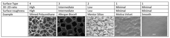 Negative contact imprinting, such as with Mentor Siltex, creates a less aggressive textured silicone surface by pressing the uncured silicone mandrel into PU foam. This results in an implant surface of type 2 with average pore diameters of 70–150 μm and depth of 60–275 μm and is meant to mimic the PU foam (Figure 1) []. In contrast to Silimed PU and Biocell, Siltex does not adhere to the surrounding tissue and is not immobile []. Motiva, using a propriety method of negative imprinting, manufacture the nanotextured SilkSurface and the micro-textured VelvetSurface (Figure 1). The pore depth on the VelvetSurface is 40–100 µm [] which is shallower than Mentor Siltex. Along with smooth implants, nanotextured implants are classified as surface type 1 (Figure 1) [].