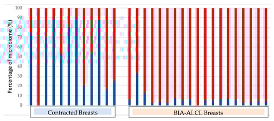 Percentage of Gram-positive (coloured blue) and Gram-negative (coloured red) organisms in capsules obtained from contracted breasts and in BIA-ALCL samples [].