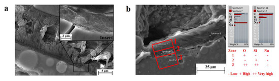 In our geopolymer matrix samples, irrespective of the weight amount of the dispersed fibers, cellulose was found to undertake a surface modification and a new phase formation at the interface with the geopolymeric matrix. Figure 4a shows detail of a cellulose fiber, whose surface is clearly modified. It is evident from the figure that the affected polymeric fibrils at the fiber surface are rearranged in an orthogonal configuration to the geopolymer interface (see insert in Figure 4a), whereas at the core, the fibrils are parallel to the interface line. EDS analysis was conducted to detect the chemical species absorbed by the new phase, and the results are reported in Figure 4b. The chemical analysis was carried out in three different zones in order to draw a conclusion regarding the elements’ absorption: zone 1—the cellulose fiber core, zone 2—the cellulose/geopolymer interface, and zone 3—the geopolymeric matrix. In all zones, the amount of sodium was the same, whereas the silicon was observed to be more abundant in zone 3 than zone 2, as expected. What was, however, unexpected was a deficiency of oxygen in the modified interface (zone 2), suggesting a condensation between the hydroxyl groups of the polymeric chains of the cellulose and geopolymer with corresponding water release. However, this hypothesis should be supported by further spectroscopic analysis, unequivocally demonstrating the formation of a new phase formed by organic–inorganic polymeric chains.