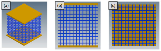 (a) Cube sample with plates on top and bottom; (b) cube sample from front view; and (c) top view of cube porous scaffold without top plate.