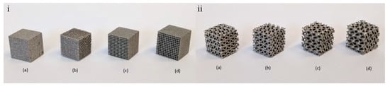 3D Printed (i) cube and (ii) gyroid samples with pore size: (a) 0.3 mm; (b) 0.4 mm; (c) 0.5 mm; and (d) 0.6 mm.