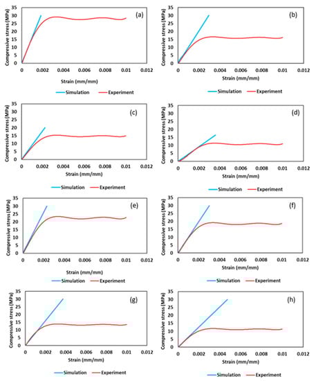Numerical and experimental stress-strain curve for: (a) cube 0.3 mm; (b) cube 0.4 mm; (c) cube 0.5 mm; (d) cube 0.6 mm; (e) gyroid 0.3 mm; (f) gyroid 0.4 mm; (g) gyroid 0.5 mm; and (h) gyroid 0.6 mm.