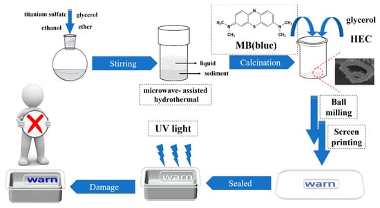 In this work, we prepared an optical oxygen indicator based on the transition of a metal oxide, namely titanium dioxide (TiO2). It is an ultraviolet (UV) photochromic oxygen indicator incorporating methylene blue (MB), TiO2, and glycerin, first introduced in 2002 []. Its mechanism is as follows: TiO2 produces electrons with high reducibility and positive charge holes after UV irradiation. These electrons are able to reduce MB (blue) into leuco methylene blue (LMB, colorless) and the positive holes are combined with glycerin [,]. TiO2-based oxygen indicators maintain their color in the absence of oxygen. LMB is oxidized to MB (blue) by oxygen when the packaging is damaged. Thus, TiO2-based oxygen indicators can used for visible and nondestructive integrity detection in MAP through color change (from colorless to blue) [].