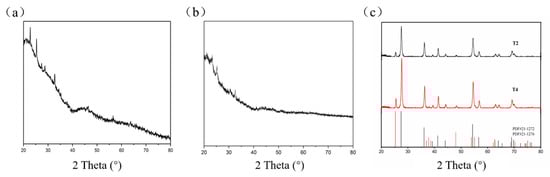 In order to determine the type of samples, we analyzed their XRD patterns first. The patterns of sample T1 and T3 (without calcination) showed no peaks relating to any crystalline phases, indicating that samples T1 and T3 were amorphous (Figure 2a,b). The calcined patterns of samples T2 and T4 (Figure 2c) exhibited peaks at 27°, 42°, 54°, and 56°, corresponding to the crystal structure of rutile TiO2 (PDF 21–1276). The other peaks at 25°, 37°, 55° and 62° corresponded to the crystal structure of anatase TiO2 (PDF 21–1272). The results suggest the synthesized products were composed of a mixture of rutile and anatase TiO2. Sample T4 (reaction time three hours) exhibited the higher crystallinity with stronger intensity compared to sample T2 (reaction time two hours), suggesting that the longer reaction time and calcination contributed to the formation of crystallization.