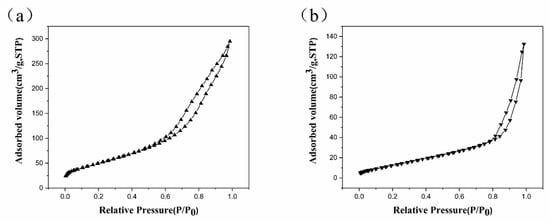 N2 adsorption isothermal diagram of (a) sample T2 and (b) sample T4.