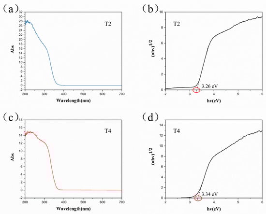 Figure 5 shows the DRS curves of T2 and T4, presenting a blue shift of reflectance. Conversion between reflectance and absorbance was carried out using the Kubelka-Munk equation []. The band gap of the samples was calculated using the Tauc plot method as 3.26 eV and 3.34 eV for T2 and T4 (Figure 5b,d), respectively. Samples T2 and T4 both displayed an increase in band gap compared with TiO2 particle (TP) (~3.20 eV), which might be attributable to the change in morphology. High excitation energy could avoid being affected by natural light as an oxygen indicator. Specifically, TiO2 with a band gap of 3.20 eV can be excited at a wavelength of 380 nm. This means visible light would be sufficient to activate TiO2 to reduce MB, producing an unsuitable and inaccurate indicator.