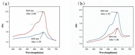 The photocatalytic performance of samples T2 and T4 during the activation stage were investigated by the reducing ability of MB in the blue bottle experiment. The two solutions were irradiated under the same UV intensity (0.5 mW/cm2) for 30 s, and the spectra of the absorbance of MB were recorded before and after irradiation. As shown in Figure 6, UV-vis analysis indicated that MB possessed two specific peaks at 610 nm and 664 nm. After 30 s UV irradiation, the two peaks almost disappeared because MB was reduced to its colorless form (LMB) by photo-generated electrons. The absorbance peak at 664 nm of sample T2 decreased from 2.00 to 1.59 (Figure 6a) after UV irradiation, approaching a drop ratio of 20.5%. The absorbance (664 nm) of sample T4 decreased from 1.93 to 1.46 (Figure 6b) with a decrease ratio of 24.4%. Due to the amount of light scattering that TiO2 used in the blue bottle solution, the absorbance value in Figure 6 was high (greater than one) [].