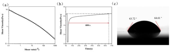 (a) Rheological curve, (b) thixotropy curve, and (c) contact angle of the oxygen indicator solution.