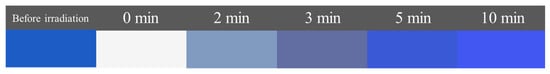 After printing on the PET film, we investigated the color change in the oxygen indicator during the recovery stage in the air, as shown in Figure 8. The initial color was blue, and after UV irradiation (as 0 min) it turned white. Then, two minutes later, the indicator was light blue. As time went on, the color deepened. The color changed back to its original blue after about five minutes. The results showed that the prepared oxygen indicator effectively responded to the oxygen.
