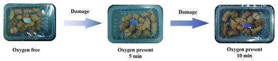 Generally, optical oxygen indicators are based on the transition of metal oxides combined with some connection material and dye. The indicator is sealed inside the MAP and detect MAP integrity using color changes. The optical oxygen indicator is a nondestructive testing technique that reduces packaging waste. MAP integrity can be detected in real-time without further operation or devices. Consumers can make a judgment through the color change of the indicator. Furthermore, this method is eco-friendly and inexpensive [,,].