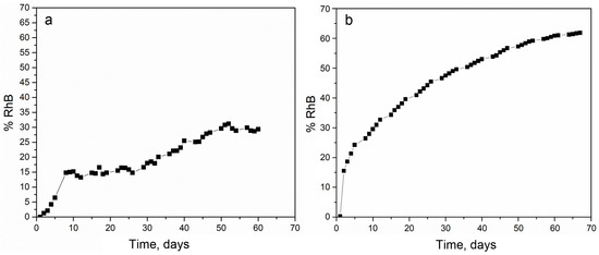 The experimental release of Rhodamine B (RhB) from poly(d,l-lactide-co-glycolide) PLGA1 (a) and PLGA2 (b) nanofiber mats.
