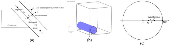 In Reference [22], a radial 1D finite element was formulated and we summarize the basic equations derived for this element here. A fiber is represented by a line composed of segments aligned on the fiber axis, with common points (Figure 3). At each common point, we generate one radial 1D element (fictitious in the FE mesh representation), which serves to represent radial diffusion within the fiber volume belonging to the common point. This belonging volume is equal to , where is the mean radius of the length belonging to the common point (it is (L1 + L2)/2 in Figure 3a).