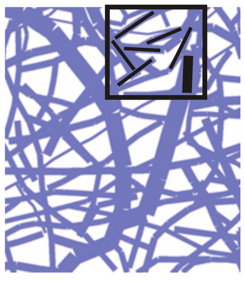 Network of fibers and a domain of finite element with indicated fiber directions (domain is 90 μm × 90 μm).