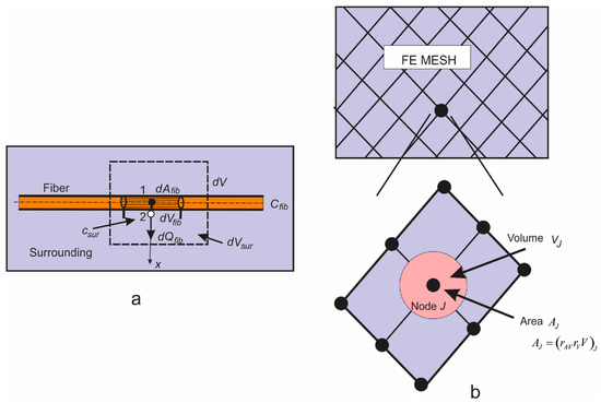 (a) Diffusion from fiber surface dAfib, which corresponds to the fiber volume dVfib and total volume dV; dVsur is the volume occupied by the surrounding medium; (b) Corresponding smeared model.