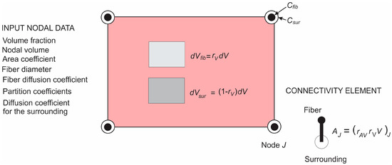 It can be concluded from the above that diffusive transport between fibers and tissue can be performed by discretizing the continuum only. The parameters of the model, assigned to each continuum node I, include geometrical data (the volumetric ratio of fibers) , the surface ratio , mean radius of fibers (), and material data of fibers consisting of diffusion coefficient and partition coefficient at the fiber surfaces.
