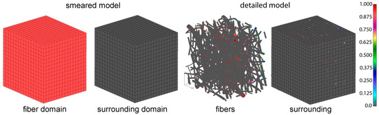 The diffusion domain model consists of fibers and surroundings filled with phenomenological fluid. The surroundings are modeled using 3D continuum elements, while fibers are approximated by radial 1D elements. The balance equation for diffusion in a 3D space, which is based on Fick’s law, can be written as: