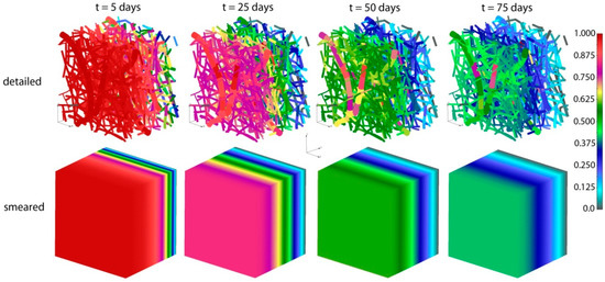 In order to determine the diffusion coefficient for the surrounding domain, a numerical homogenization procedure was performed according to Reference [32]. It was found that diffusion is reduced in the surrounding due to the attractive forces between fibers and diffusion molecules, and also by the presence of fibers in the system. The equivalent diffusion coefficient in the surrounding domain was found to be Dliquid = 0.004 µm2/s. The parameters used in our composite smeared finite element (CSFE) model are: