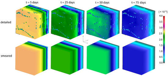 PLGA implant—concentration field for the detailed and smeared model, for the diffusion of Span-80/RhB complex within the PLGA implant.