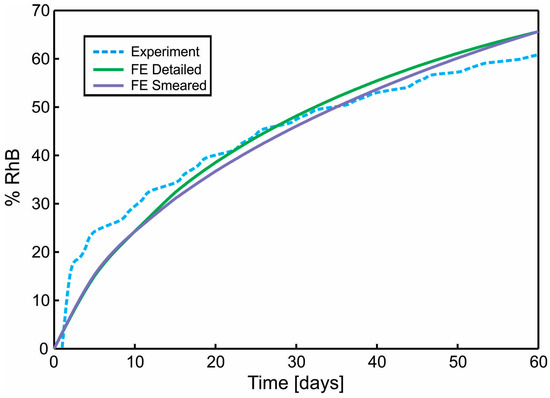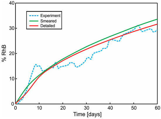 Diagram Cumulative Release vs. Time. Comparison of results for the true (detailed) and smeared model of PLGA nanofibers, with Span-80/RhB complex impregnated and for 24 wt.% 50:50 PLGA. Experimental curve and computational results obtained using true (detailed) and smeared model of PLGA nanofibers.