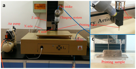 The 3DP system consists of extrusion system, liquid crystal display (LCD) operation panel, air pump, XYZ axle and charging system, and the macrograph of 3D printer is shown in Figure 2a,b. The largest printing size of 3D printer is 0.8 m × 0.8 m × 0.8 m. The SAC paste was continuously extruded through the manner of screw mixing under the air pump pressure of 0.3 MPa, loading speed of 15 mm/s and printing speed of 10 mm/s. Figure 2c shows a printed sample with the size of 25 mm × 25 mm × 70 mm (10 layers).