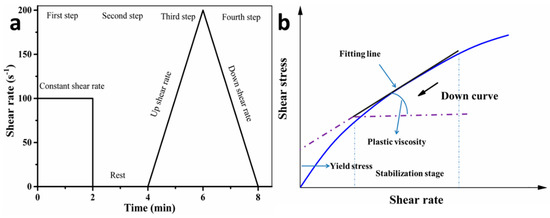 (a) The test program of rheology and (b) The fitting line of plastic viscosity and yield stress was obtained by the calculation of Bingham model based on the down curve of shear stress