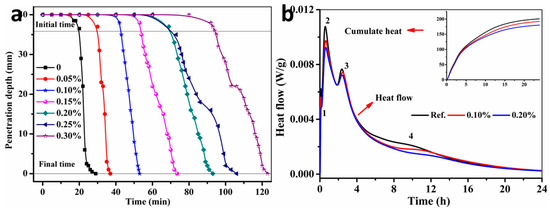 The setting time and hydration evolution are of great importance to control the printing time and quality of the SAC. In this paper, TA was used as the retarder to optimize both parameters to satisfy the requirements of 3DP. Figure 4 shows that the setting time and hydration evolution of fresh SAC paste with different additions of TA. From Figure 4a, it is clear to see that the addition of TA presents a significant retardation for the fresh SAC paste. Compared with the controlled SAC paste without TA, the initial and final setting time of SAC paste can be prolonged to 22–98 min and 30–123 min by adding 0.05% to 0.30% of TA, respectively. In addition, Figure 4b shows the heat flow and cumulative heat curves of SAC paste with different additions of TA, which can be divided into four stages. The first stage is the dissolution of solid powders to water. The second and third stage result from the formation of AFt (C3A·3C$·H32; C = CaO, A = Al2O3, $ = SO3, H = H2O) which is the major hydration product of C3A and C4A3$ (C3A + 3C$ + 32H → C3A·3C$·H32; C4A3$ + 2C$ + 38H → C3A·3C$·H32 + 2AH3). The fourth stage is caused by the formation of AFm (C3A·C$·H12; C4A3$ + 18H → C3A·C$·H12 + 2AH3) which generates from the hydration of C4A3$ in the lack of gypsum [29]. More importantly, it also indicates that the addition of TA significantly inhibits the transformation from AFt to AFm in the SAC. The possible reason is that a water film can be generated on the surface of C3A and C4A3$ due to the high affinity (–OH groups) of TA to Al3+ and thus reduce the hydration of both minerals. In addition, TA, as a kind of calcium chelating ligand, can coordinate with Ca2+ on the surface of cement particles by the function of COO− groups, which can generate a complex only sparingly soluble in water [30]. Based on the two reasons above, the hydration rate and cumulate heat of SAC paste can be reduced with the increasing addition of TA.