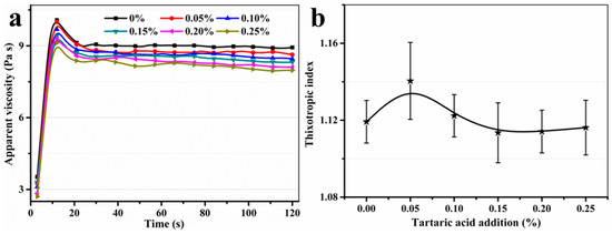 (a) The apparent viscosity and (b) thixotropic index of fresh SAC paste with different additions of TA under a constant shear rate of 100 s−1.