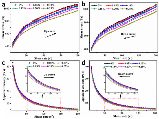 The rheology properties of the fresh SAC paste with different additions of TA under a varying shear rate from 10–200 s−1: (a,b) shear stress of up curves and down curves; (c,d) apparent viscosity of up curves and down curves.