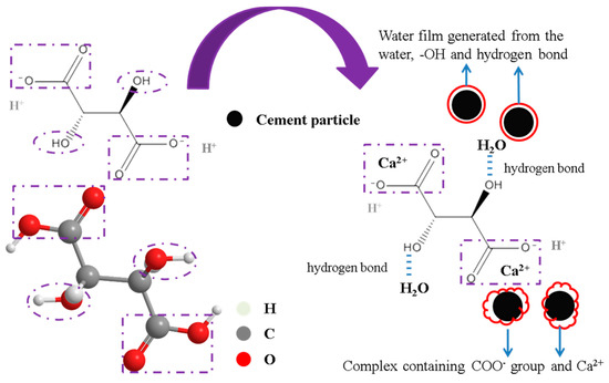 Figure 7 shows the retardation and rheology mechanism of TA in the 3DP SAC paste. On the one hand, –OH groups from the TA can induce the formation of water film on the surface of cement particles through the hydrogen bonds. This behavior can facilitate the relative motion among different particles and decrease the internal friction. On the other hand, COO− groups from the TA can coordinate with Ca2+ released from the hydration of C4A3$ to generate a stable complex which prevents the water contacting with cement particles. Therefore, more free water exists in the fresh SAC paste, which is beneficial to reduce the viscosity of the mixture [31,32]. By the two ways above, the hydration and rheology properties of 3DP SAC paste are significantly influenced by adding TA.