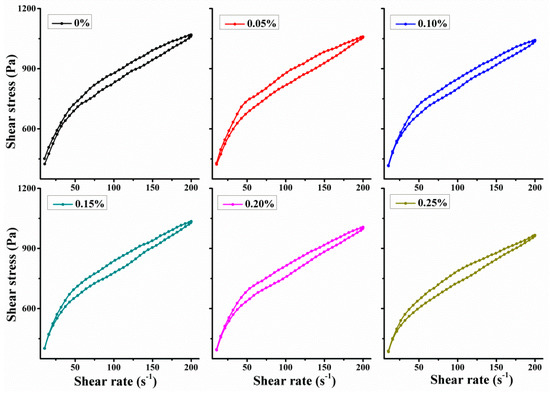 3DP technology requires the cementitious materials to present a high viscosity and low deformation. Therefore, a good thixotropy should ensure the build-up of 3D structures. Figure 9 shows the hysteresis loop curves of up and down shear stress. The area of the hysteresis loop indicates the thixotropy variation, which can be expressed as: