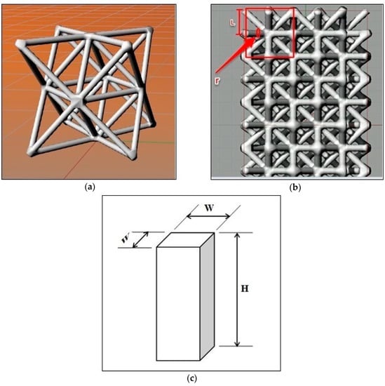 In this structure, the cell is a cube with a side of 4 mm, which encloses the octal structure. Octet-truss structures were designed within a square base prism, with length to width ratios of H/W = 2 and H/W = 4 (Figure 1c). A toggle-false feature was selected so that the program could make the surfaces of the structure, continuous, in the prism, and connected to each other. Preliminary tests showed a higher strength for those prismatic structures that had toggle-false features than those with toggle-true. Therefore, the toggle-false structures have been used in this paper.