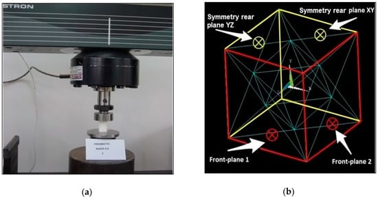 Each specimen was manufactured in accordance with Section 6.2 of the ASTM D695-02a standard [30]. It was prismatic in shape, with its length being twice its principal width. Initially, the dimensions were 10 × 10 × 20 mm3. However, when the elastic modulus is desired, the test specimen should be of such dimensions that the slenderness ratio is in the range from 11 to 16. In this case, the preferred specimen sizes were 10 × 10 × 40 mm3 (Figure 1c and Equations (2)–(5)).