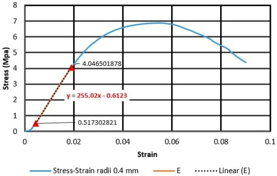 Figure 3 shows an example of the linear regression at the initial slope of the stress–strain curve, to obtain the modulus of elasticity.