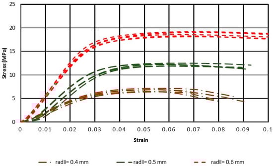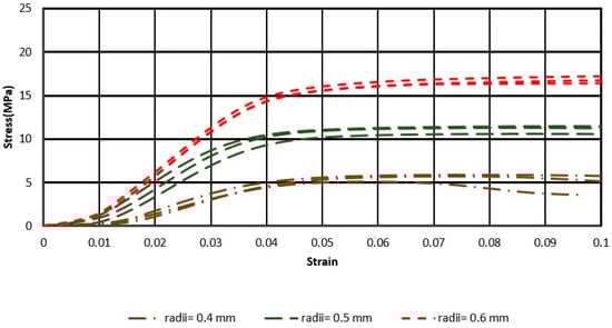 Stress–Strain diagram for the five samples with H/W = 4, of octet, with radii of struts 0.4, 0.5, and 0.6 mm.