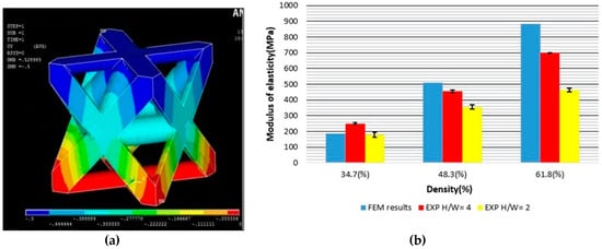 (a) UY results of the octet-truss. (b) Modulus of elasticity (MPa) vs Density (%) (Comparison of FEM results with experimental results for H/W =2 and H/W=4 respectively).