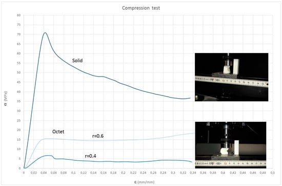 As an illustration of the specimen densification process, the stress–strain curves are presented in Figure 7. These were obtained from a compression test, until extreme deformation of the specimens occurred. Three curves are shown—a solid specimen and two octet specimens—with different radii of the struts. It should be noted that the specimens have been manufactured under conditions different from the previous ones, so the numerical values could not be compared.
