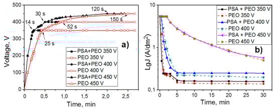 Figure 1 shows the voltage and current density as a function of the PEO processing time of aluminum alloy AA2024 without and with PSA pre-treatment. Different stages of PEO treatment can be distinguished in the graphs. During the first stage (until the voltage reaches the predetermined values of 350, 400, and 450 V, respectively), the current density was constant at 5 A dm−2 (so called galvanostatic or constant current oxidation (CC-mode)). During the second period, the process proceeded at a constant voltage (potentiostatic or constant voltage oxidation (CV-mode)) and the current density changed. At the moment of the CC to CV mode transition, the current density decreased immediately.