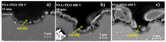 Under lower voltages of PEO processing, the formation of coatings with relatively uniform structure (both on bare and on PSA pre-treated AA2024 alloy) is observed (Figure 4). However, with the increase in the oxidation voltage, the larger cavities, located between the dense inner barrier layer and the outer looser layer of the PEO coating, were noticed for the PEO coatings obtained after PSA anodizing. The tendency of pore number reduction, as well as enlargement of the individual pore diameter, as a function of voltage as described previously in Reference [27] was observed, leading to the increase in roughness of the layer.