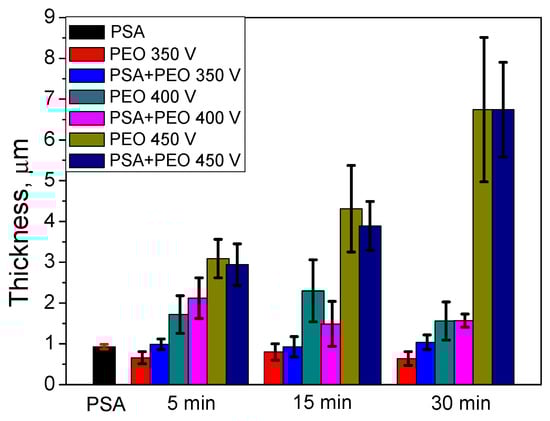 Using cross-section SEM analysis (Figure 4), the average thickness of the coatings was determined. The preliminary formed PSA layer influenced not only the parameters of the PEO coating formation, but also the coating thickness. Under a voltage of 350 V, the PSA pre-treatment increased the thickness, whilst under higher voltages, the behavior was the opposite and the PEO coatings that formed on the bare material were thicker (Figure 3 and Figure 5). It could be explained that under 350 and 400 V, the PSA layer was not completely converted to a PEO layer and the resulting total thickness of the PSA + PEO coatings was higher than the PEO coatings on bare alloy. The thinner layer of PEO + PSA under 450 V in comparison with PEO on bare AA2024 could be explained by the complete transformation of the anodic PSA layer, which reduced the total time available for PEO formation.