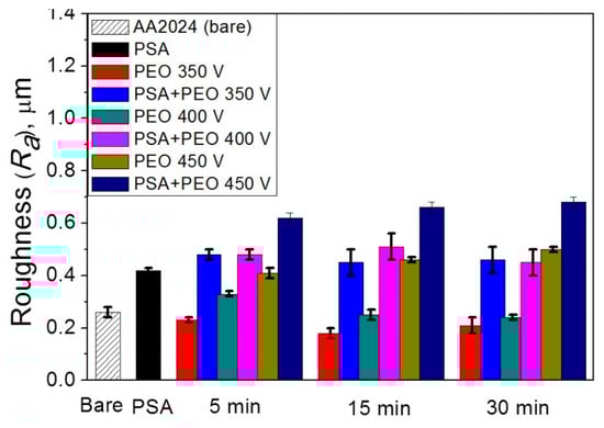 The roughness Ra (b) of the PSA and the PEO coating, at different voltages (350–450 V) and times (5–30 min) without and with PSA pre-treatments.