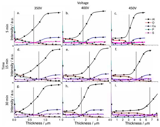 Qualitative depth profile measured by GDOES of PEO coated AA2024 at different voltages (350–450 V (vertical)) and times (5–30 min (horizontal)), without PSA pre-treatments (the dashed line indicates the thickness of the coatings).