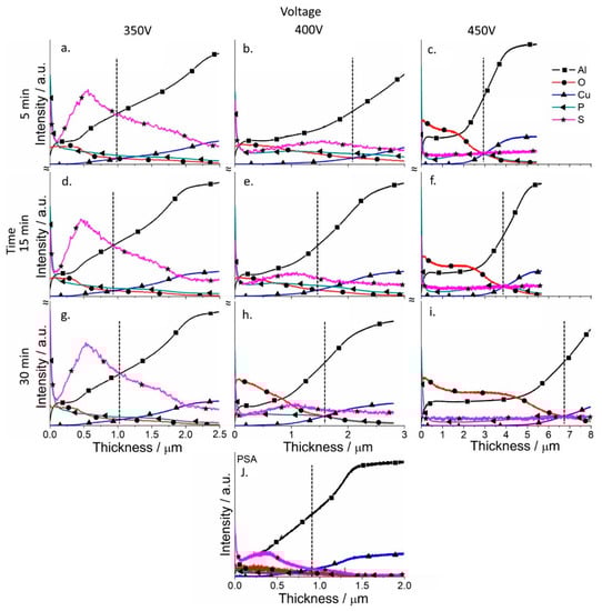 Qualitative depth profile measured by GDOES of PSA (j) and PSA-PEO (a–i) coated AA2024 at different voltages (350–450 V (vertical)) and times (5–30 min (horizontal)), with PSA pre-treatments (the dashed line indicates the thickness of the coatings).