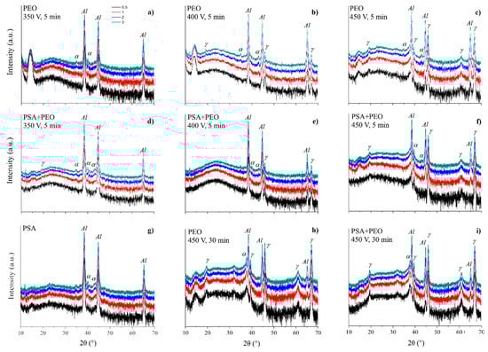 Figure 9 shows the XRD patterns of PSA and PEO coated AA2024 without and with pre-anodizing PSA treatment at different voltages (350–450 V). The formation of PEO coatings in the presence of PSA occured in a manner similar to the case when PSA was absent (the comparison was made using the peaks of α-Al2O3 at 2θ = 35°, 43°, and peaks of γ-Al2O3 at 2θ = 39.6°, 45.9°, 67°). However, as can be seen from Figure 9, preliminary anodizing (i.e., PSA in this work) promoted the formation of PEO coatings with lower crystallinity, and even at 450 V, almost no corundum (α-Al2O3) phase was detected. The characteristic peaks of γ-Al2O3 also had a lower intensity, and even for the PEO coating formed under 350 V, no peaks of crystalline Al2O3 were detected. This fact confirmed that the previously formed PSA layer facilitated the sparking initiation, leading to a lower current density during the PEO treatment and reducing the overheating of the system, leading to the formation of more amorphous PEO coatings.