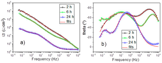 Figure 10 demonstrates the fitting results of the impedance spectra obtained after 2 h, 6 h, and 24 h, using the equivalent circuits from Figure 11a–c, respectively. In all the cases, the constant phase element was used instead of an ideal capacitor to account for the non-uniformities and associated dispersion of the capacitive response. A high quality of fitting could be evidenced, as also confirmed in Table 1 with acceptable goodness and relatively low errors associated with the main parameters.
