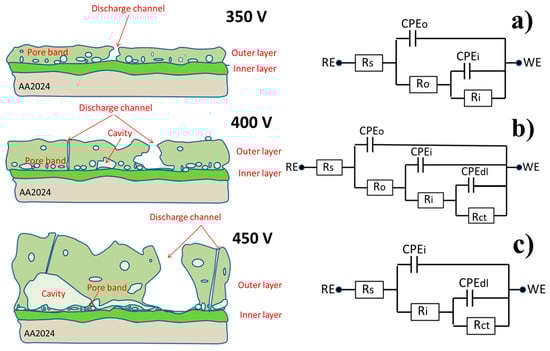 The schematic presentation of the PEO coatings on AA2024, as a function of applied voltage and respective equivalent circuits (a) 350V, (b) 400V, (c) 450V.
