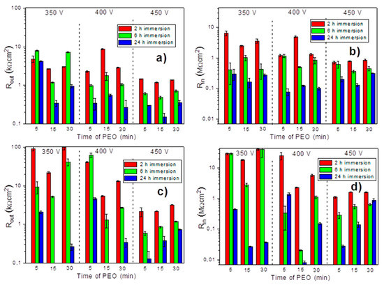 The resistance of the outer (a,c) and inner (b,d) layers for the PEO coatings (a,b) and PEO coatings with pre-anodized PSA layer (c,d) during immersion 0.5 wt % NaCl (2, 6 and 24 h) (The results of the PEO-PSA sample obtained under 350 V after 24 h of immersion are presented and explained in Figure 10 and Table 1.).